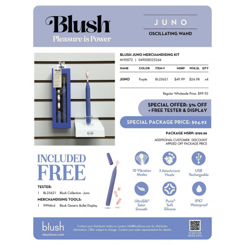 Blush Juno Merchandising Kit Includes: (4) BL-25621 - Blush - Juno Included For Free: (1) BL-25621 - Blush - Juno Tester (1) 99946-d - Blush Generic Bullet Display - White