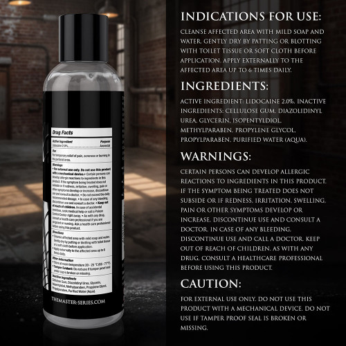 Feeling discomfort during intimate experiences? Our premium anal lubricant, enhanced with 2% lidocaine, helps reduce sensitivity for greater relaxation. Its long-lasting water-based formula offers smooth consistency without leaving any messy residue–simple to clean with soap and water. Designed for extended enjoyment, this product takes the worry out of your most adventurous moments. Say goodbye to discomfort and hello to worry-free exploration today. Make Fisting Even Better!: Use lube that lasts as you explore your anal limits! Long Lasting: Specially designed to last through long, intense sessions. Water-Based: This water-based lubricant is compatible with all toy types, leaves no stains, and is easy to clean with soap and water. Mild Desensitization: Numb sensitive areas with this lube that consists of 2% lidocaine. Active Ingredients: Lidocaine 2.0%Inactive Ingredients: Cellulose Gum, Diazolidinyl Urea, Glycerin, Isopentyldiol, Methylparaben, Propylene Glycol, Propylparaben, Purified Water (Aqua).